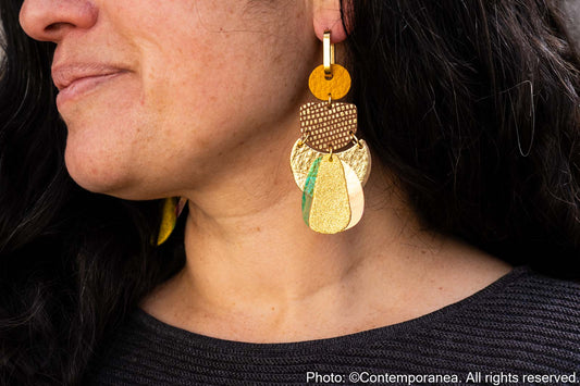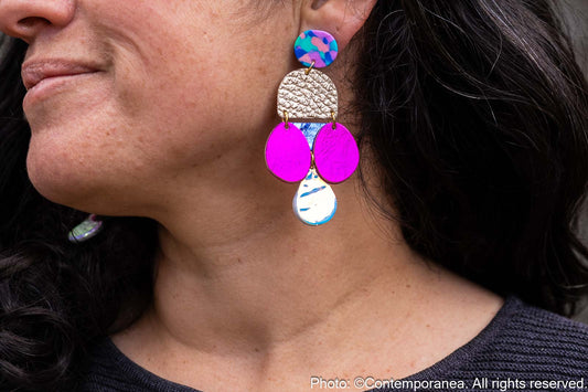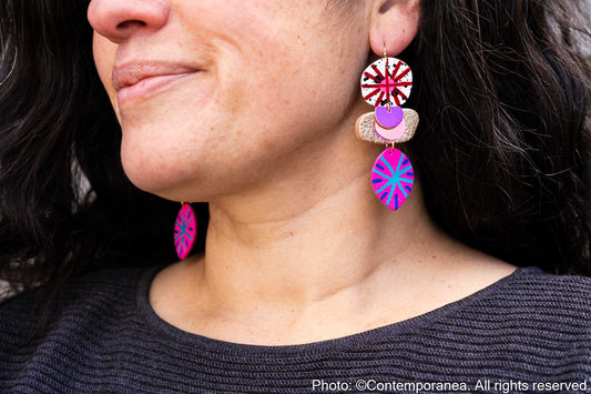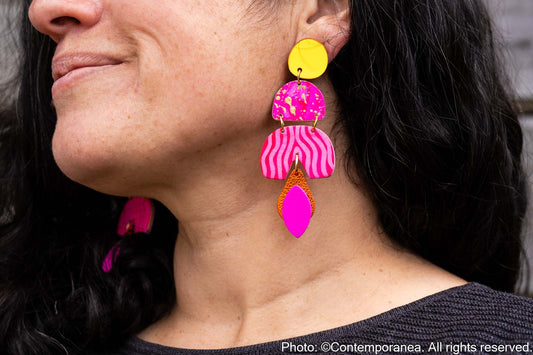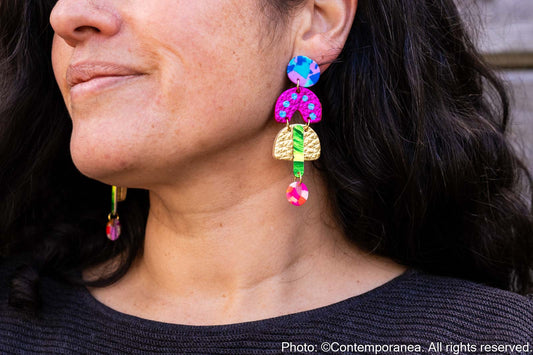 Each component is handmade in her home studio with care and precision ensuring every pair is truly a one of a kind piece of wearable art. Her creative passions and unique styles are driven by vibrant colours, luxurious textures, patterns and mixed materials.