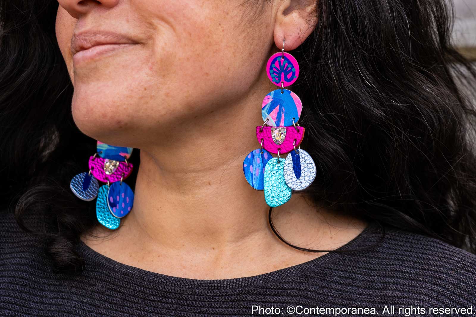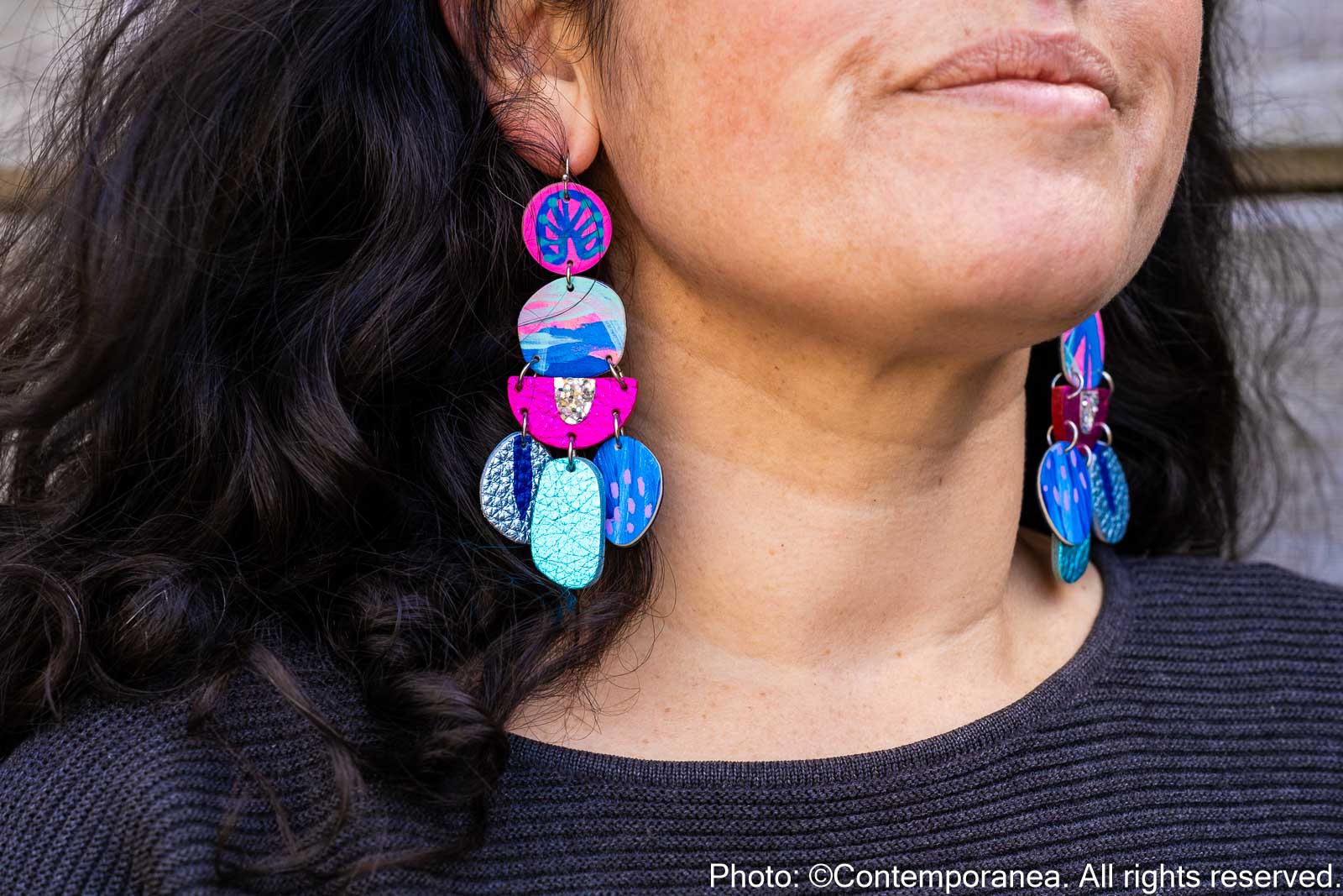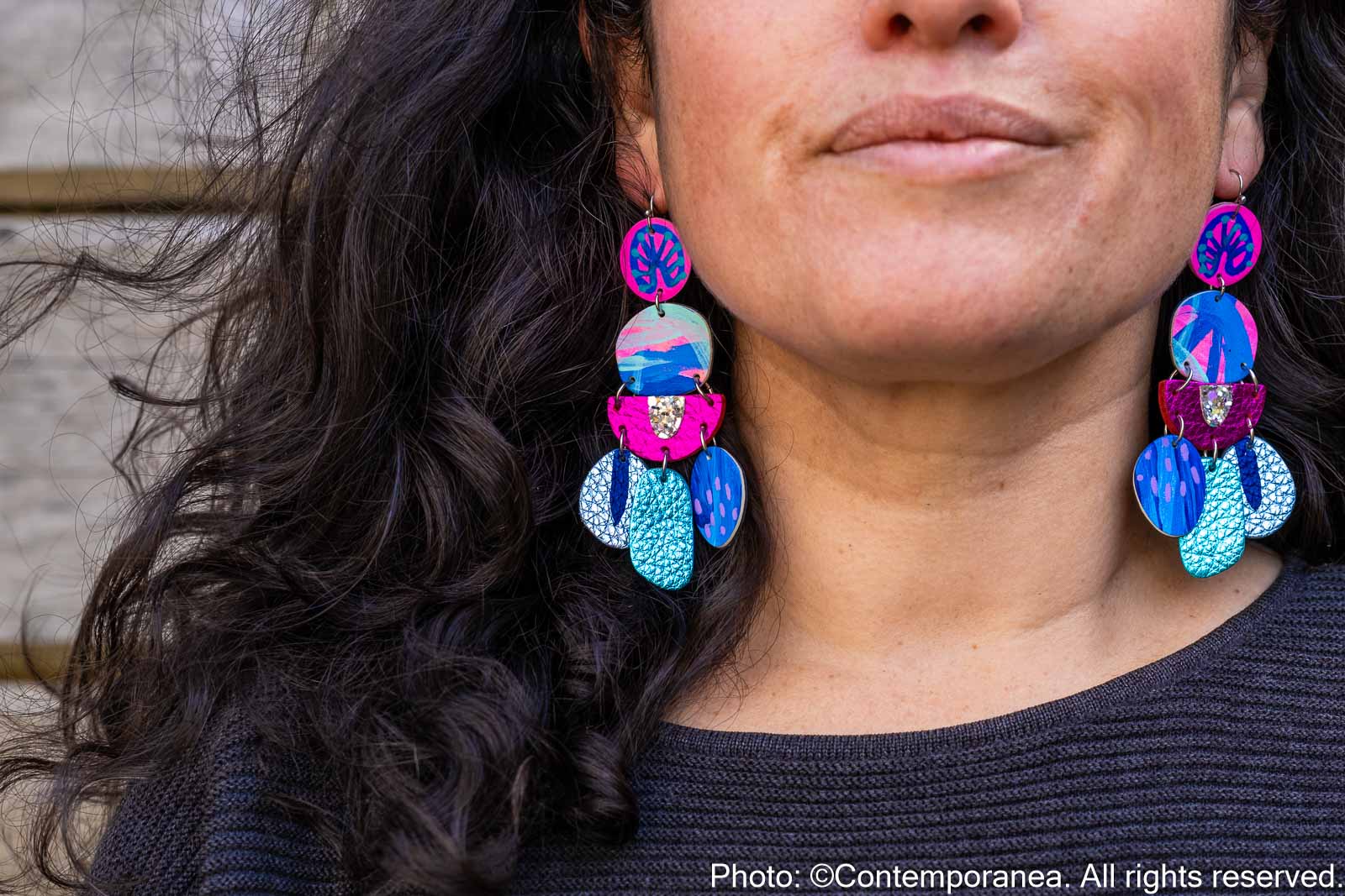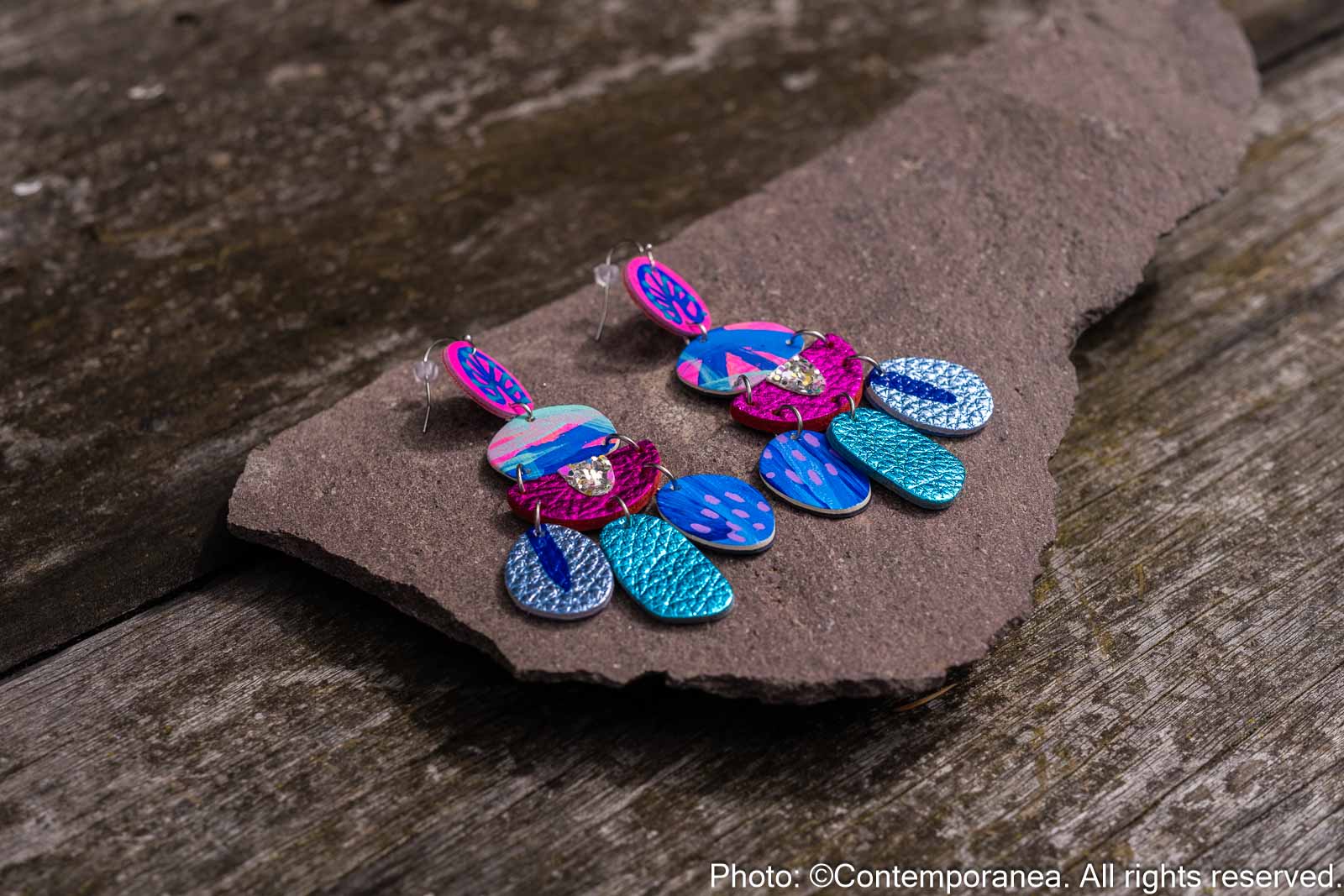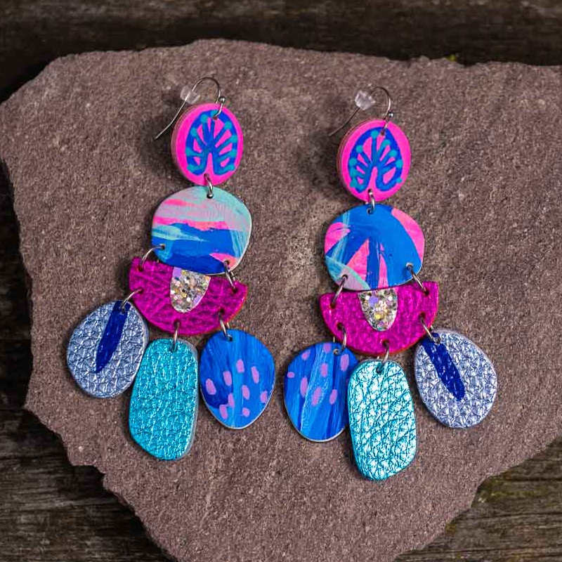 Cosmic Bloom is pure drama. Four tiers of genuine leather in rich blues, purples and pinks, designed to move, catch the light, and turn heads. A true statement piece, as bold as it is beautiful.