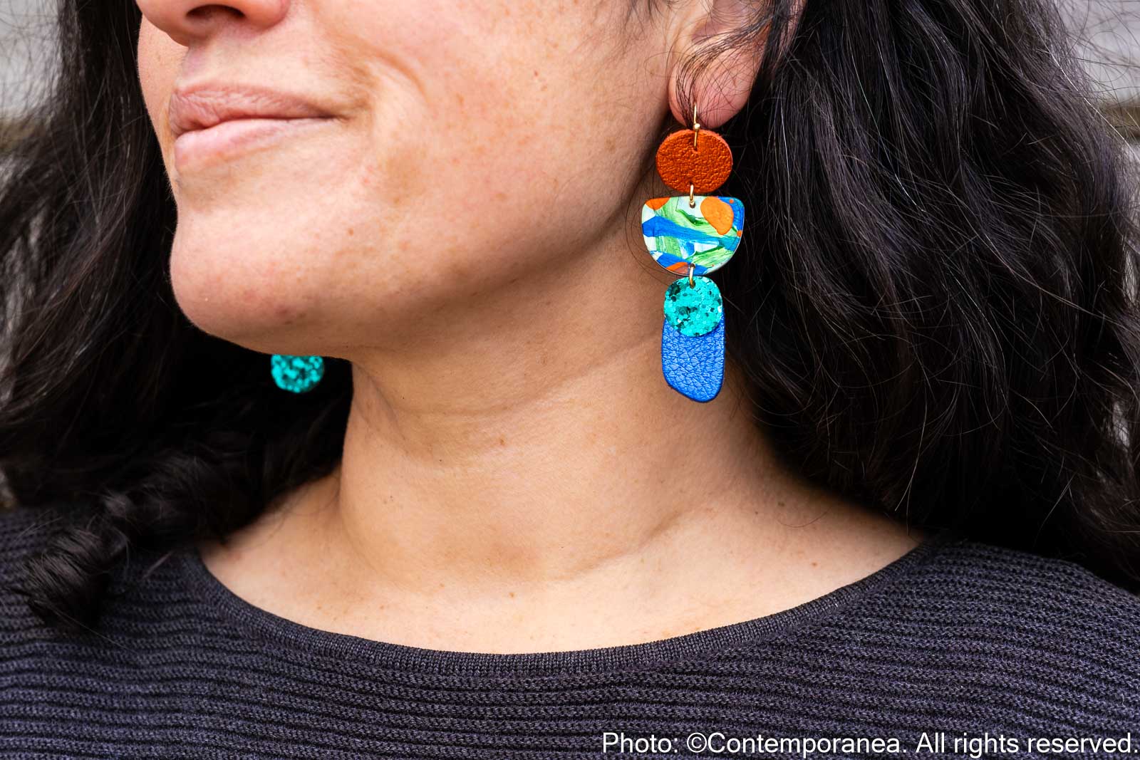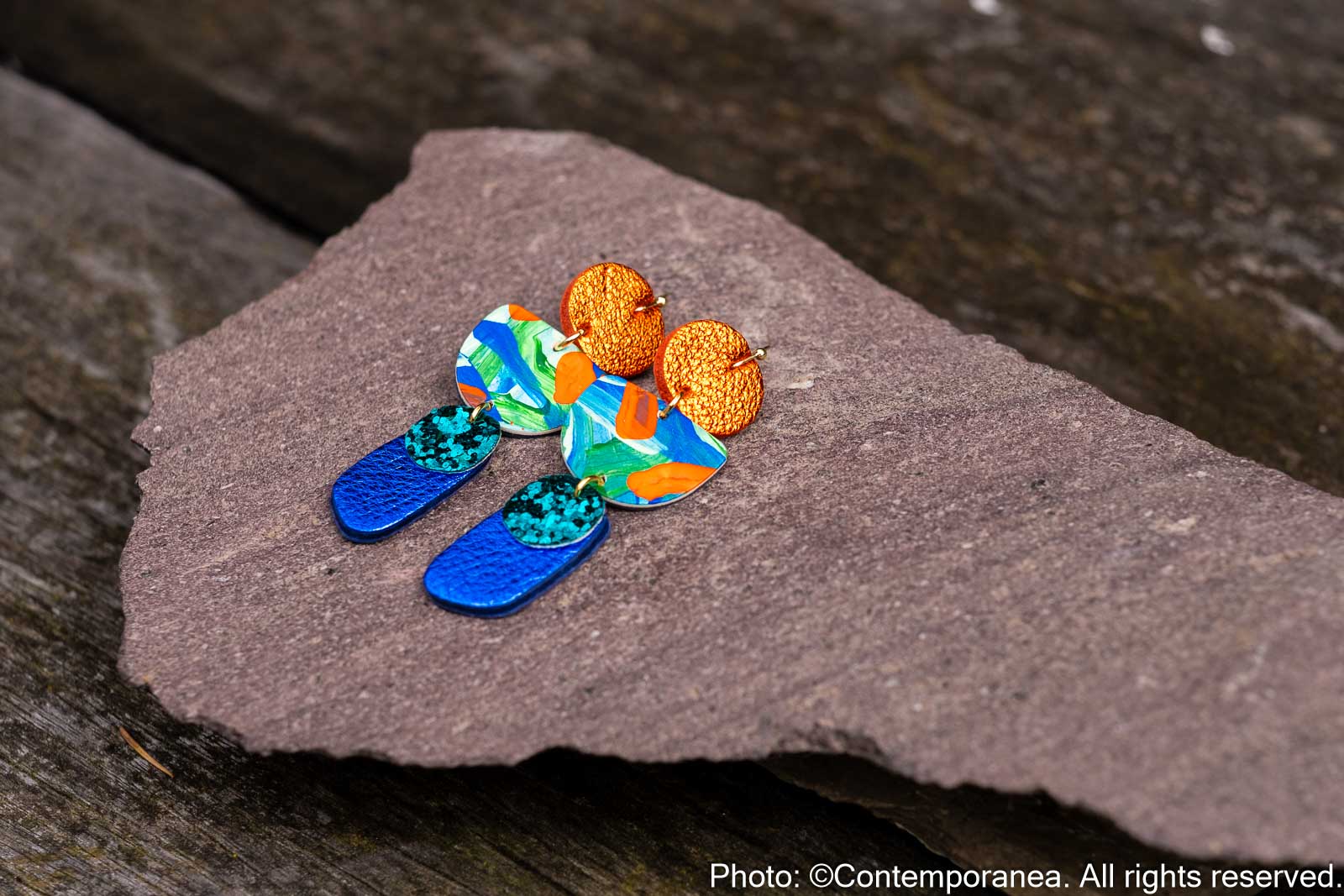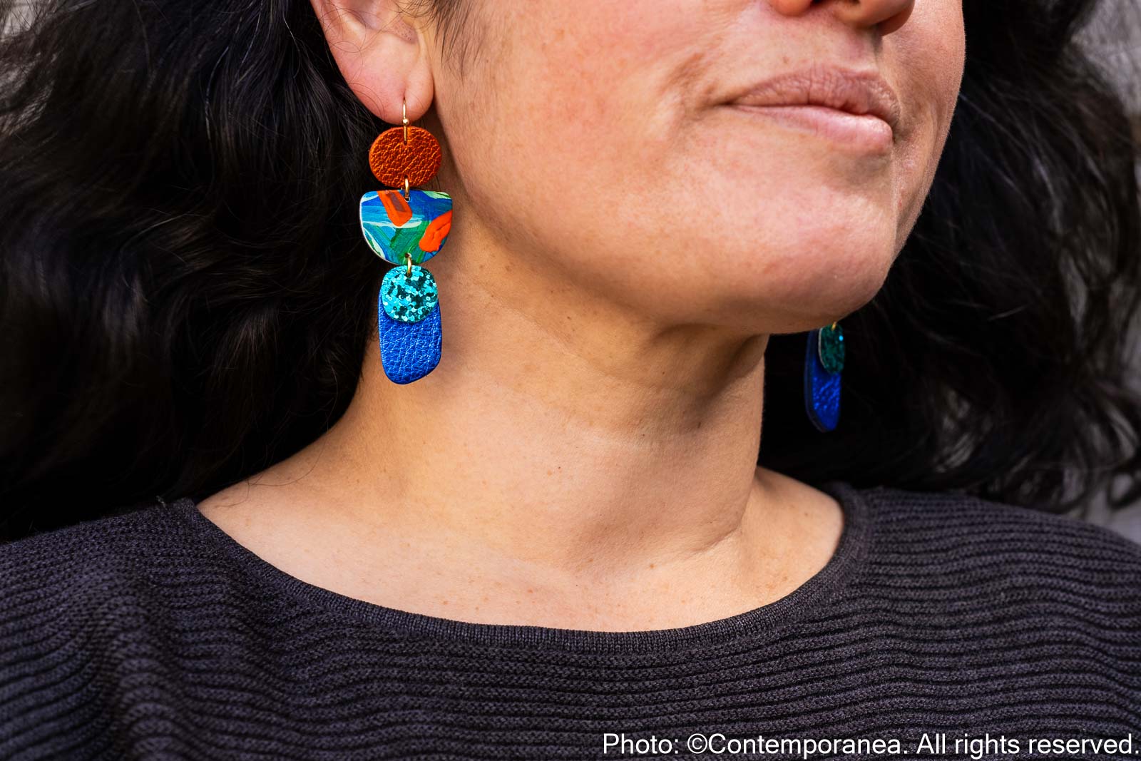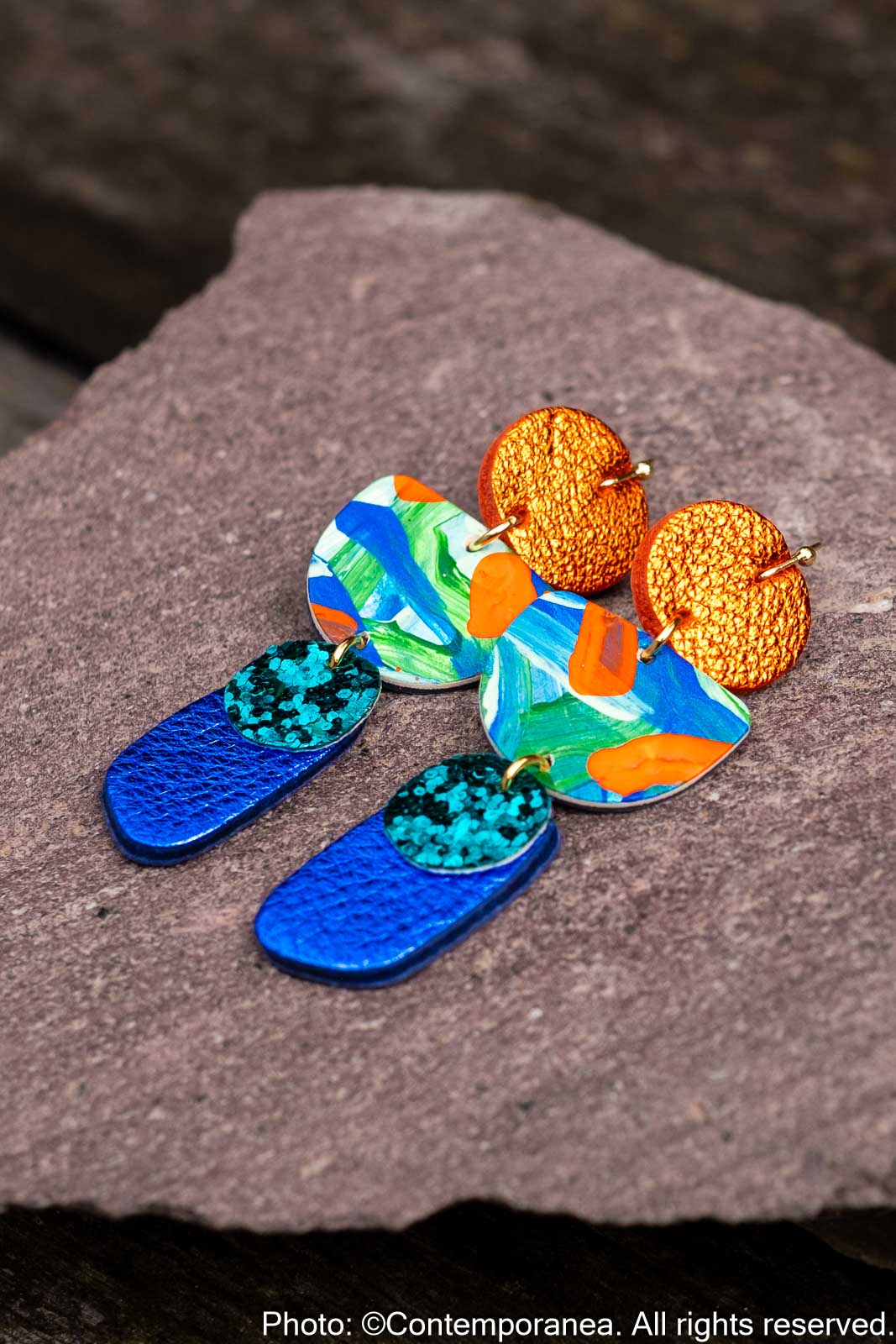 Flourish Mystic Rivers is rich in texture and movement. Genuine leather beads in metallic orange and blue with hand painted details and jade glitter, hung from golden stainless steel hooks. Lightweight, comfortable, and unique in pattern placement between pairs.