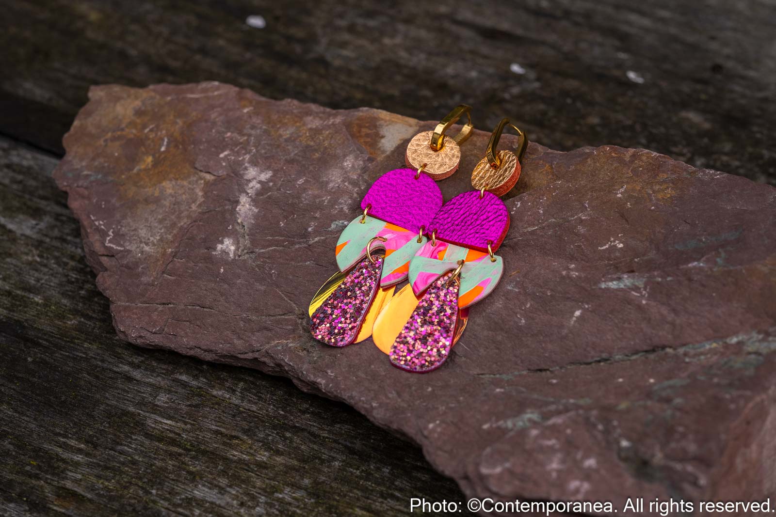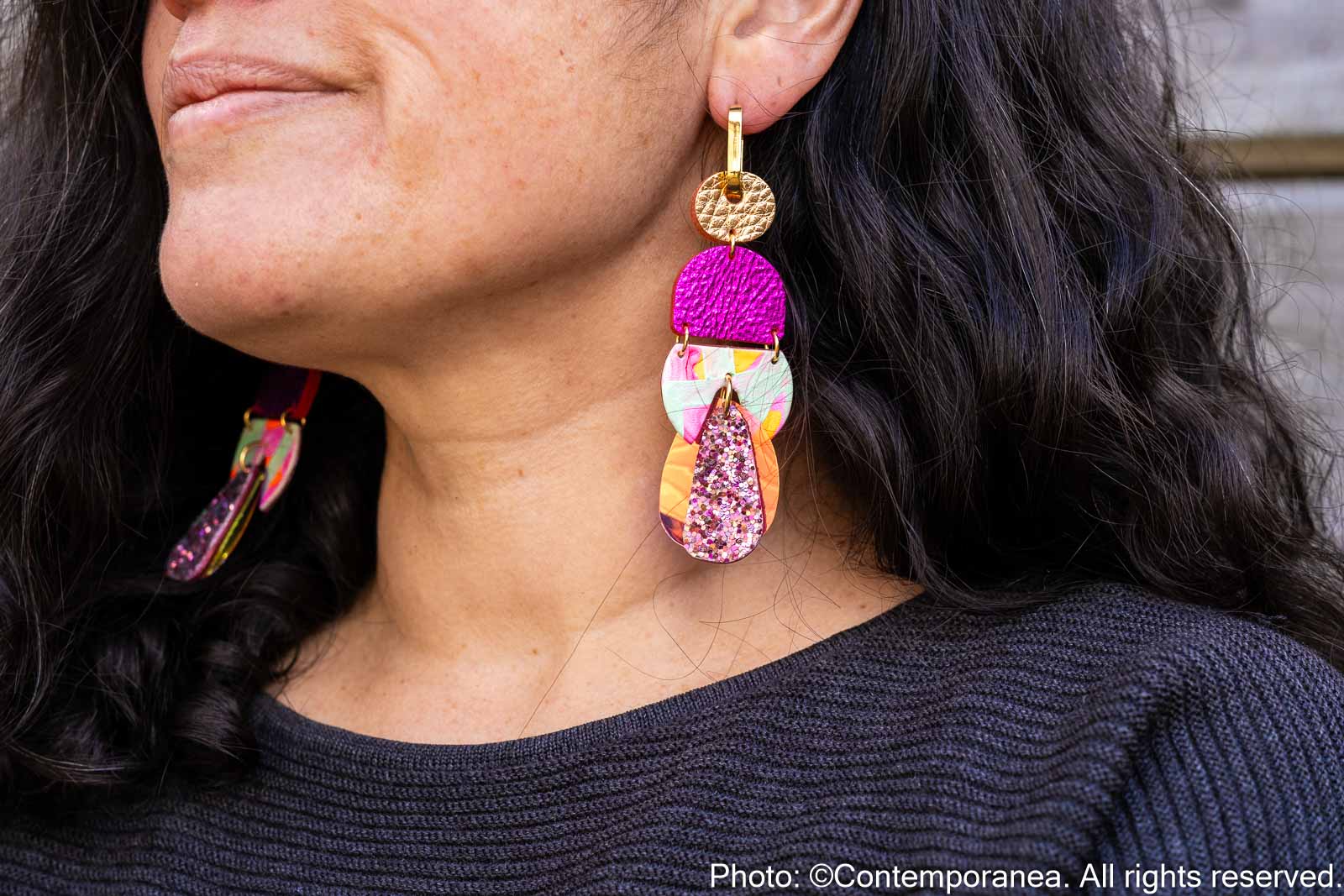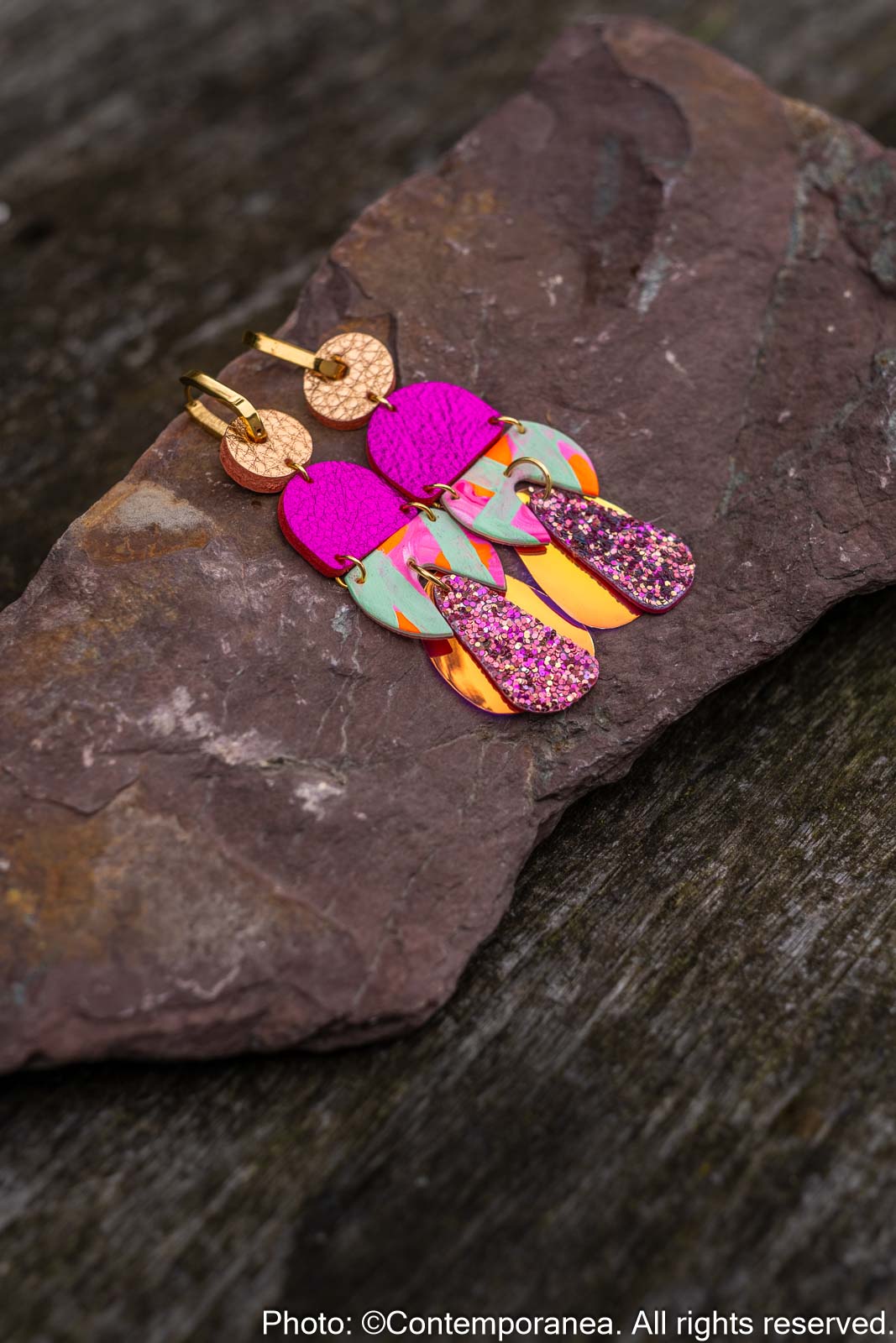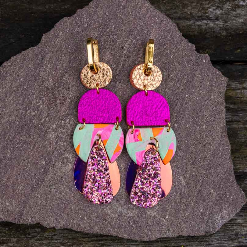 Rose Delights is a joyful mix of colour and texture. Metallic rose gold and pink genuine leather beads are paired with glitter and hand painted leather in mint, neon pink and orange, set on chunky gold stainless steel hoops. Very lightweight and full of energy.