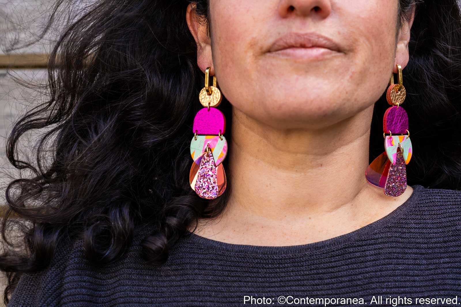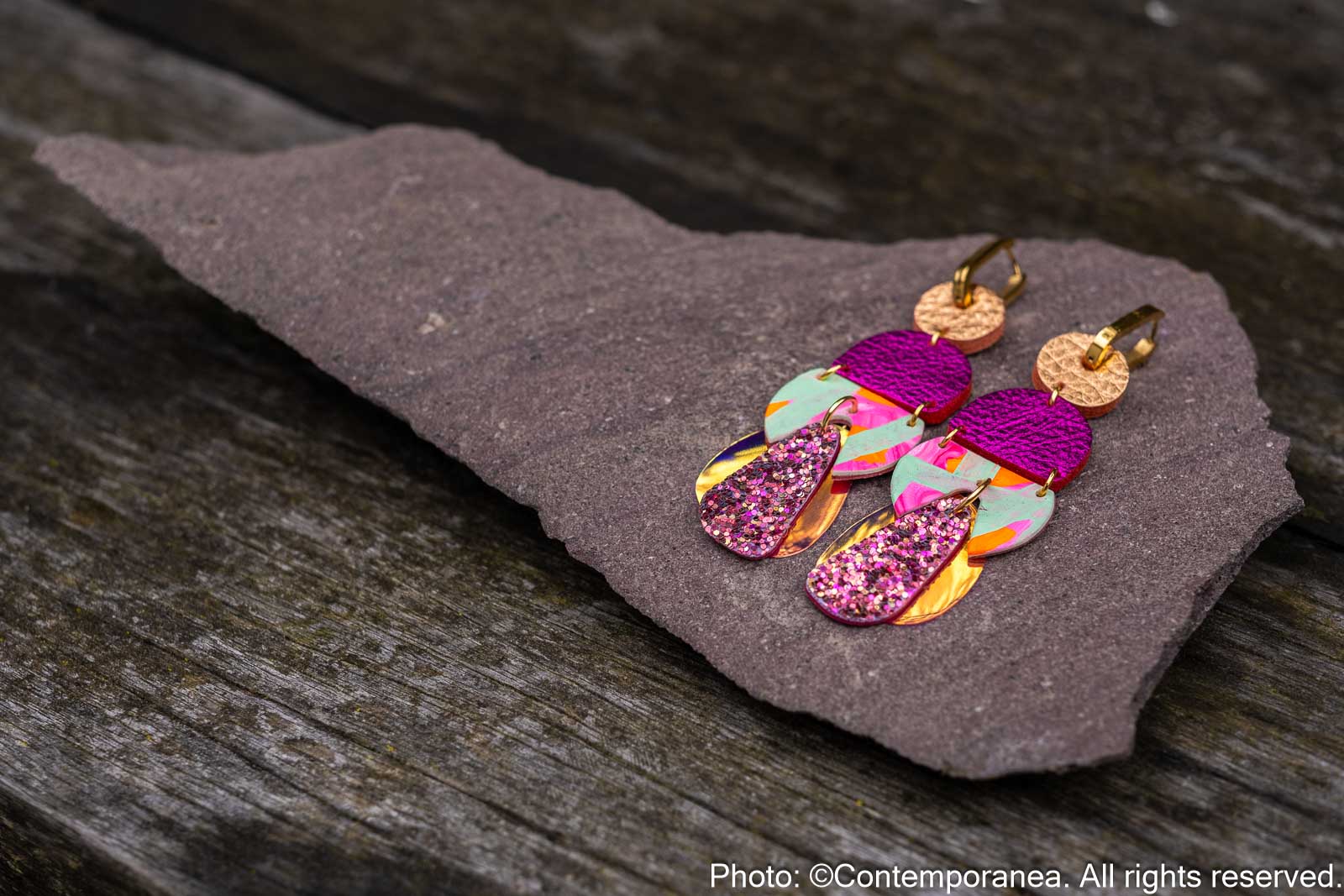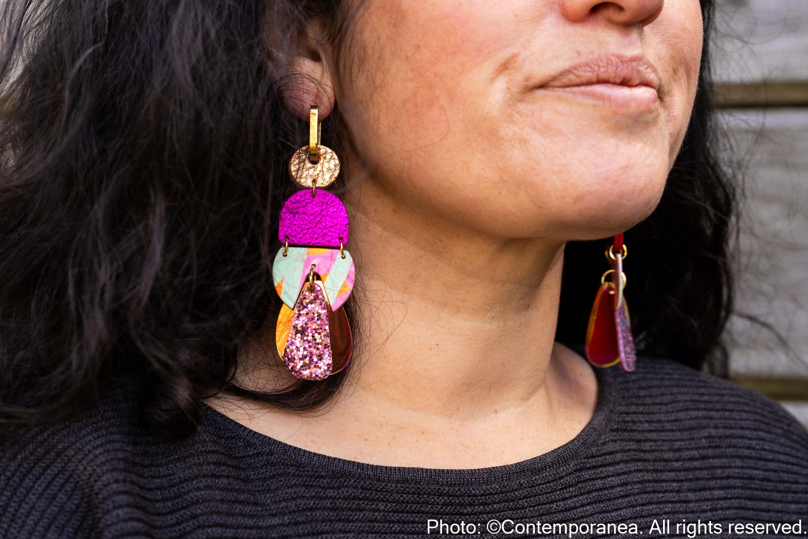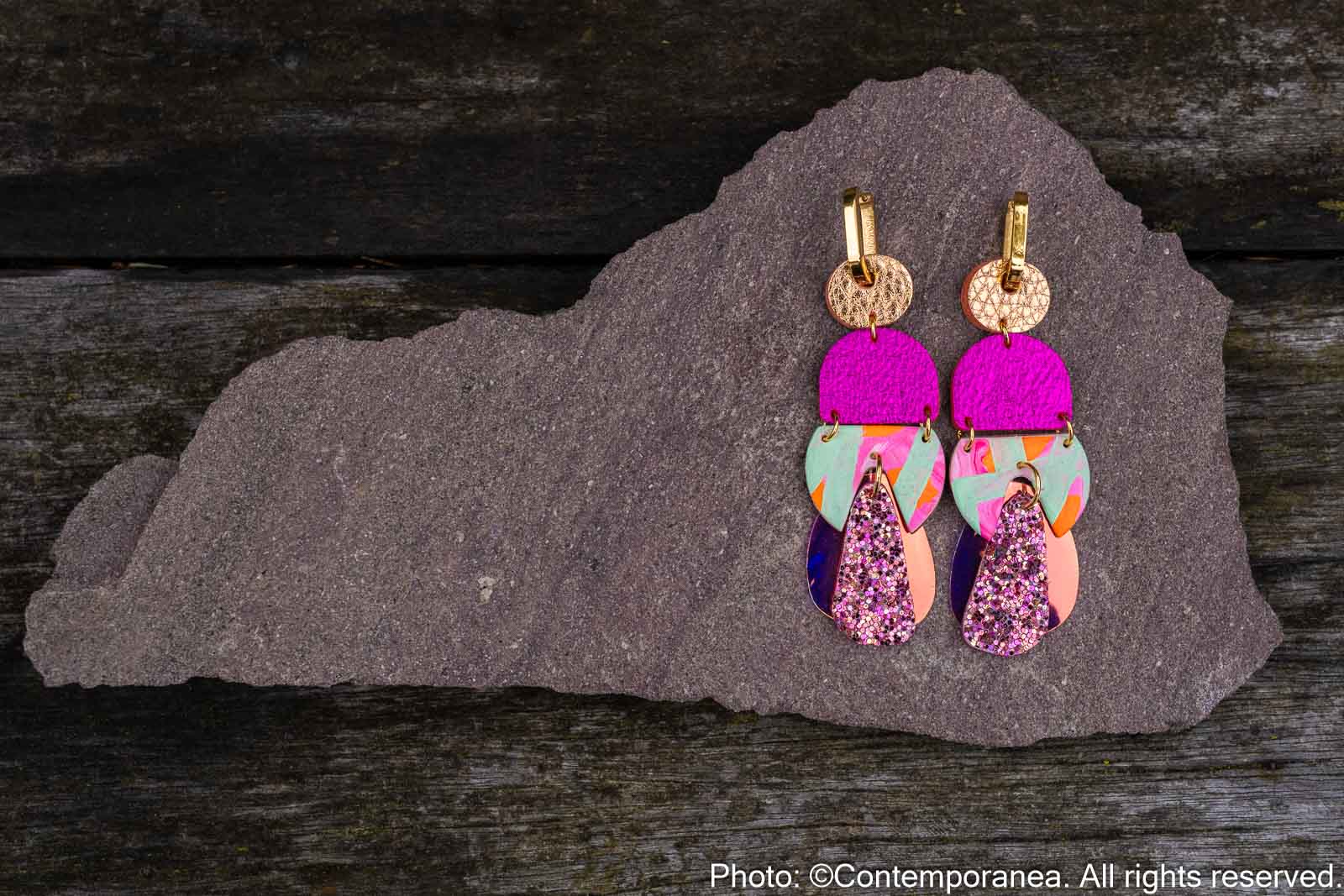 Rose Delights is a joyful mix of colour and texture. Metallic rose gold and pink genuine leather beads are paired with glitter and hand painted leather in mint, neon pink and orange, set on chunky gold stainless steel hoops. Very lightweight and full of energy.